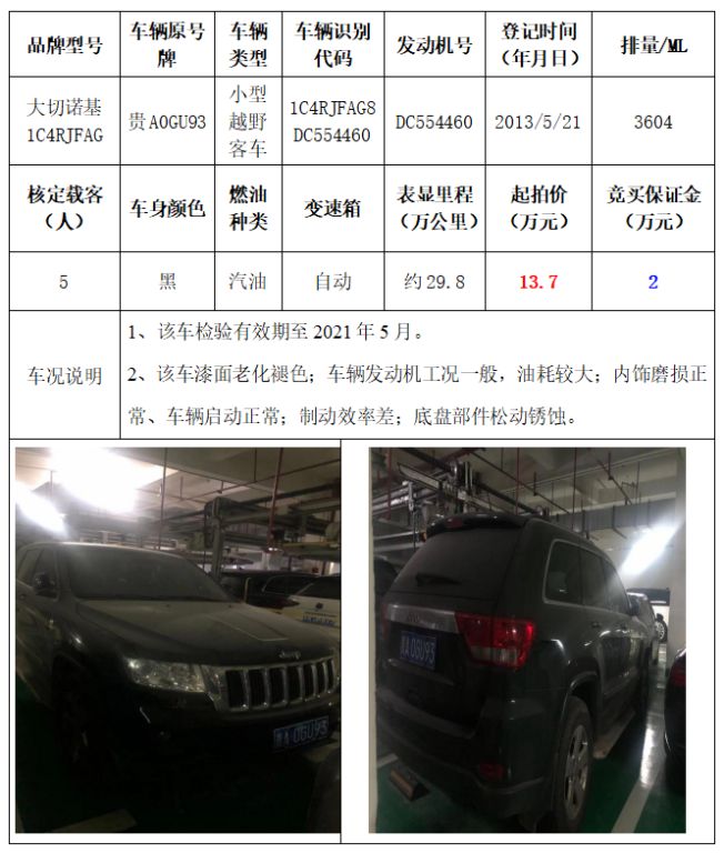 拍品編號(hào)1:大切諾基1C4RJFAG小型越野客車(chē)(原號(hào)牌貴A0GU93)一輛