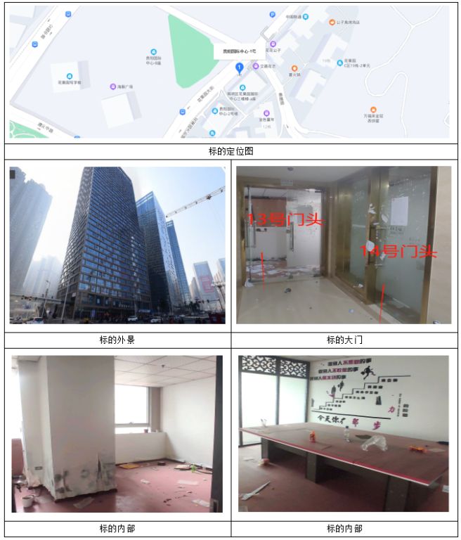 標(biāo)的位于貴陽(yáng)市南明區(qū)花果園彭家灣花果園C區(qū)(貴陽(yáng)國(guó)際中心1號(hào))11棟1單元19層13號(hào)、14號(hào)花果園商鋪(商業(yè)寫字樓),房屋為一般裝修,包含水電敷設(shè)及安裝、地面地磚、墻面刷瓷粉及乳膠漆、頂面鋁扣板吊頂、玻璃門。其中標(biāo)的3號(hào)建筑面積為99.97㎡、套內(nèi)面積為73.48㎡;標(biāo)的4號(hào)建筑面積為71.26㎡、套內(nèi)面積為52.38㎡。