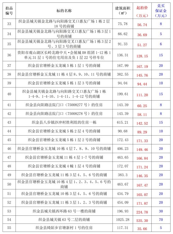受委托,我公司定于2022年12月26日(星期一)14:30時,在織金縣金中路57號(織金農商銀行二樓會議室)公開拍賣以下標的:織金縣房地產(chǎn)55處。(詳見標的清單)