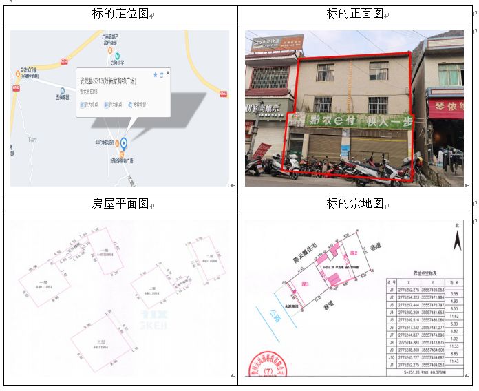 標的坐落于安龍縣興隆鎮(zhèn)當朝村狗廠組,房屋總層數(shù)3,其中1幢1-3層證載建筑面積:297.04㎡,2幢1層證載建筑面積:3.8㎡,3幢1層證載建筑面積:48.29㎡,房屋產(chǎn)權證號:安房權證興隆鎮(zhèn)字第00003465號,設計用途分別為辦公住宅、住宅,混合結構;土地使用權證號:安國用(2014)第13號,證載土地使用權面積:251.3㎡,實測土地使用權面積251.28㎡,地類(用途)金融用地,使用權類型為出讓,終止日期為2054年11月22日止。