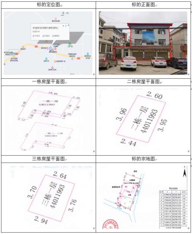 標的坐落于安龍縣新橋鎮(zhèn)新橋居委會,房屋總層數(shù)3,其中1幢1-3層證載建筑面積:312.26㎡,實測建筑面積:338.52㎡,2幢1層證載建筑面積:10.81㎡,實測建筑面積:9㎡,3幢1層證載建筑面積:9.72㎡,實測建筑面積:10.42㎡,房屋產(chǎn)權證號:安房權證新橋鎮(zhèn)字第00003462號,設計用途分別為辦公住宅、其它,混合結構;土地使用權證號:安國用(2014)第20號,證載土地使用權面積:443.24㎡,實測土地使用權面積443.24㎡,地類(用途)金融用地,使用權類型為出讓,終止日期為2054年11月22日止。