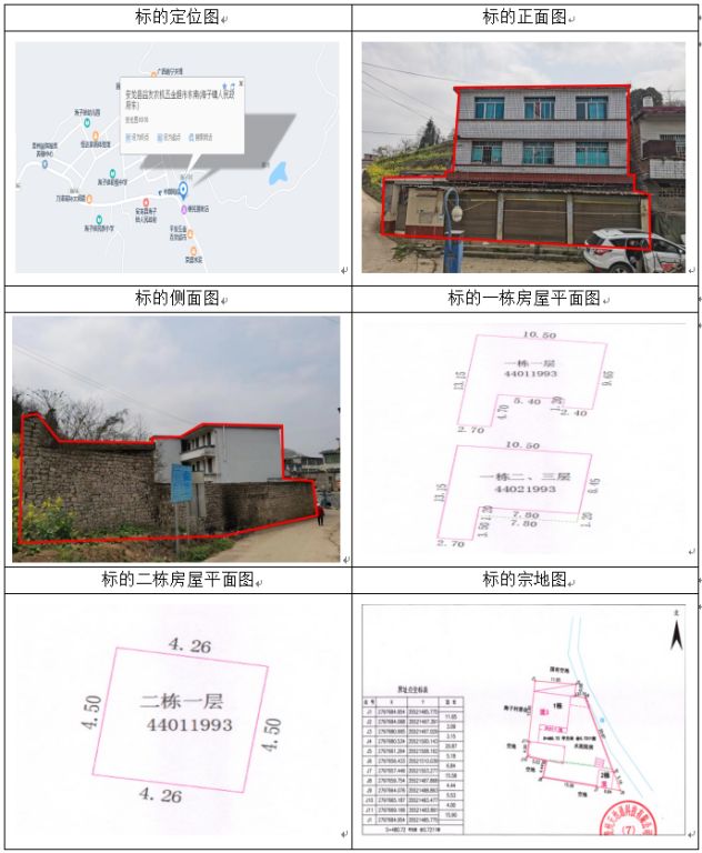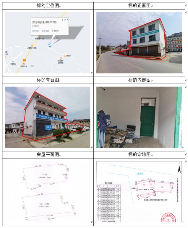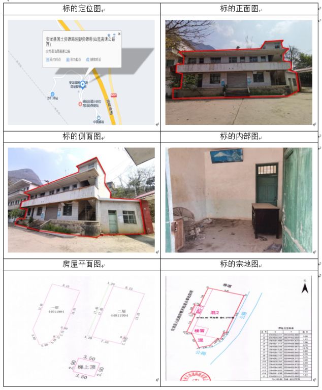 標的坐落于安龍縣海子鄉(xiāng)海子村海二組,房屋總層數(shù)3,其中1幢1-3層證載建筑面積:319.19㎡,實測建筑面積316.52幢1層證載建筑面積:17.11㎡,實測建筑面積19.17房屋產(chǎn)權證號:安房權證海子鄉(xiāng)字第00003470號,設計用途分別為辦公住宅、其它,混合結構;土地使用權證號:安國用(2014)第18號,證載土地使用權面積:476.74㎡,實測土地使用權面積480.72㎡,地類(用途)金融用地,使用權類型為出讓,終止日期為2054年11月22日止。