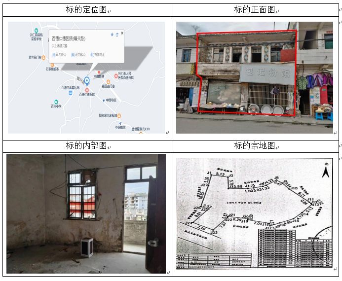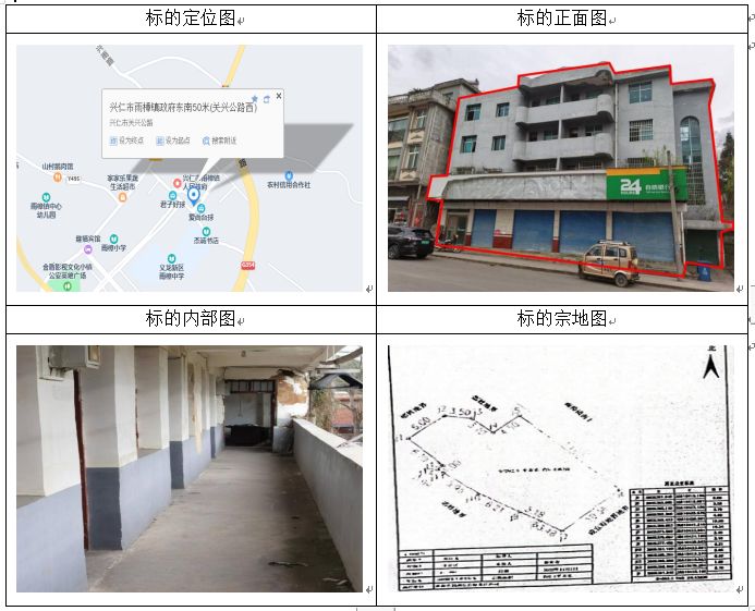 標(biāo)的坐落于貴州省興仁市屯腳鎮(zhèn)街上,房屋總層數(shù)4,所在層數(shù):1-5層,共有宗地面積401.37㎡,房屋建筑面積:607.4㎡,房屋結(jié)構(gòu):混合結(jié)構(gòu),房屋產(chǎn)權(quán)證號:黔(2023)興仁市不動產(chǎn)權(quán)第0005222號,權(quán)利類型:國有建設(shè)用地使用權(quán)/房屋所有權(quán),權(quán)利性質(zhì):出讓/自建房,用途:商務(wù)金融用地/商業(yè)、金融、信息,使用期限:2012年9月29日起2052年9月28日止。