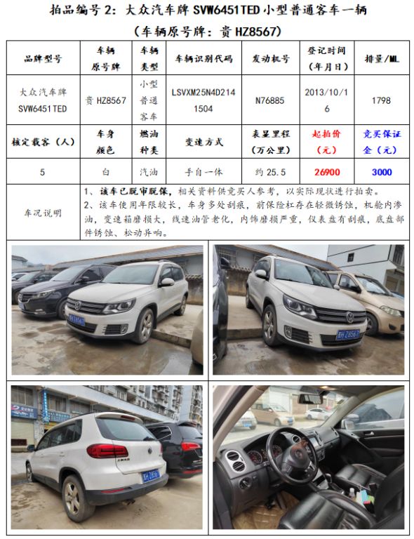 拍品編號1:大眾汽車牌SVW6451TED小型普通客車一輛(車輛原號牌:貴HY2788);