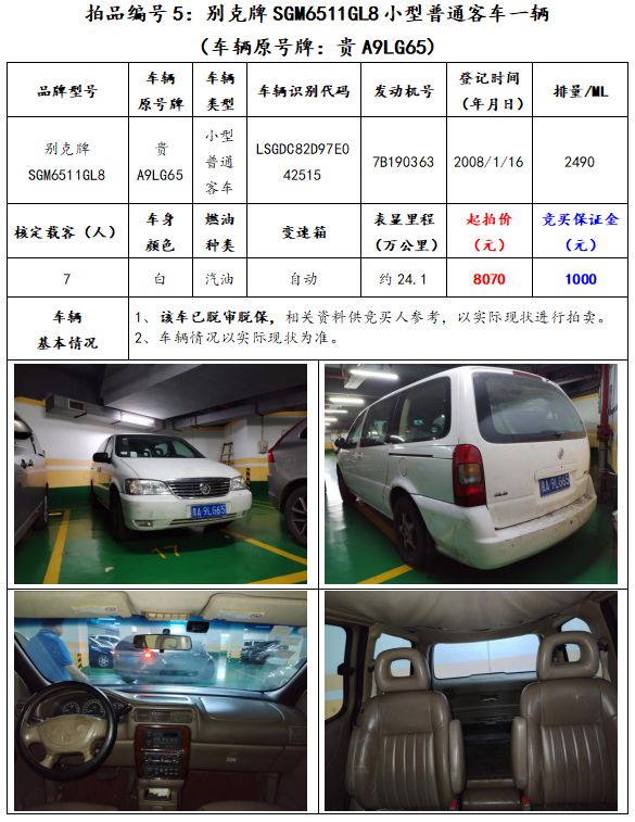 拍品編號5:別克牌SGM6511GL8小型普通客車一輛(車輛原號牌:貴A9LG65);