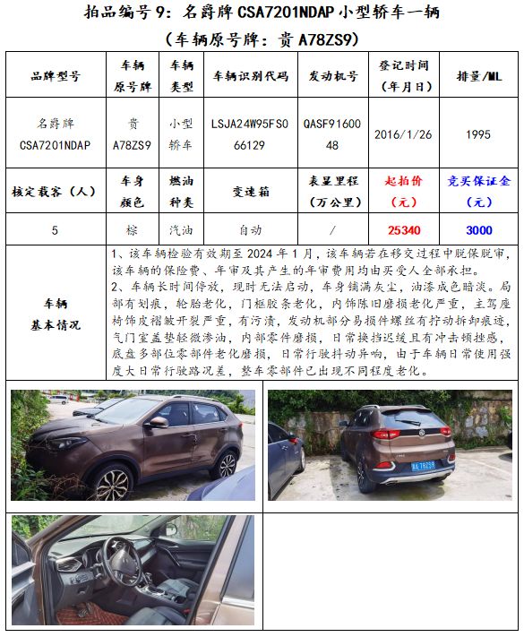 拍品編號9:名爵牌CSA7201NDAP小型轎車一輛(車輛原號牌:貴A78ZS9)。