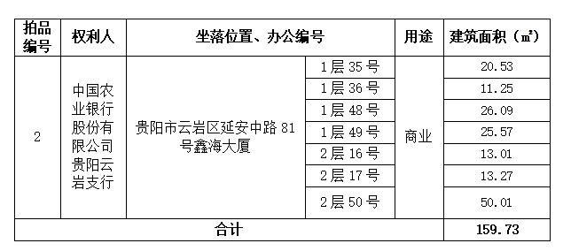 2、貴陽市云巖區(qū)延安中路81號鑫海大廈1層35、36、48、49號及2層16、17、50號商業(yè)房地產(chǎn)(總建筑面積:159.73㎡)