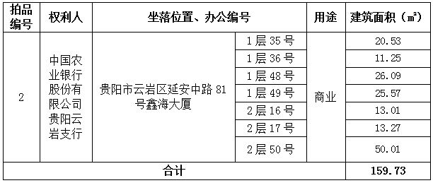 2、貴陽(yáng)市云巖區(qū)延安中路81號(hào)鑫海大廈1層35、36、48、49號(hào)及2層16、17、50號(hào)商業(yè)房地產(chǎn)(總建筑面積:159.73㎡)。