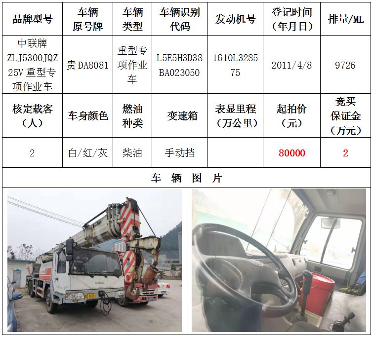 1、中聯(lián)牌重型專項(xiàng)作業(yè)車一輛,起拍價(jià):80000元,競買保證金:2萬元;