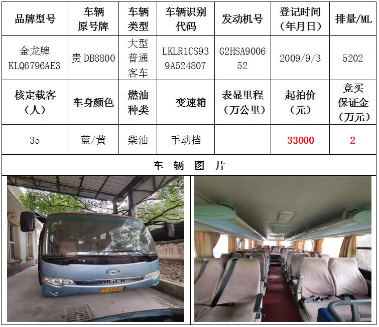 2、金龍牌大型普通客車一輛,起拍價(jià):33000元,競買保證金:2萬元;