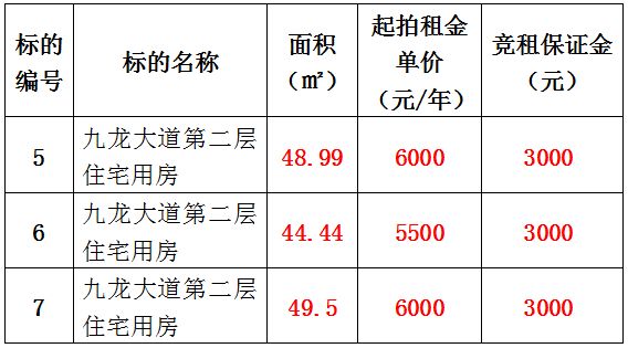 5、九龍大道第二層住宅用房1號(hào)、2號(hào)、3號(hào),面積分別為:48.99㎡、44.44㎡、49.5㎡,租賃期均為:3年,起拍租金單價(jià)分別為:6000元/年、5500元/年、6000元/年,競租保證金分別為:3000元;