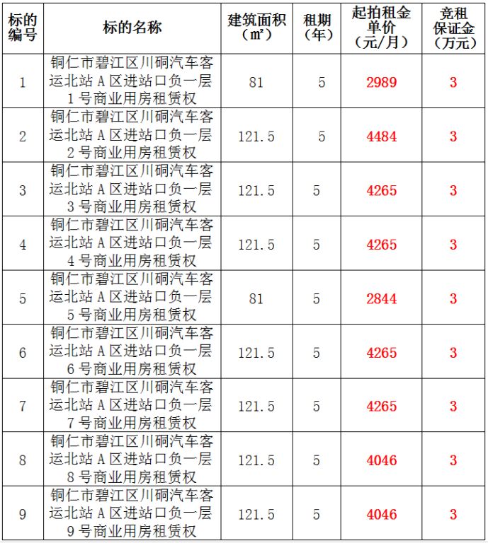 3、銅仁市碧江區(qū)川硐汽車客運北站A區(qū)進站口負一層3號門面租賃權,面積:121.5㎡,租賃期:5年,起拍租金單價:4265元/月,競租保證金:3萬元;