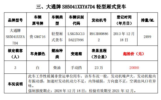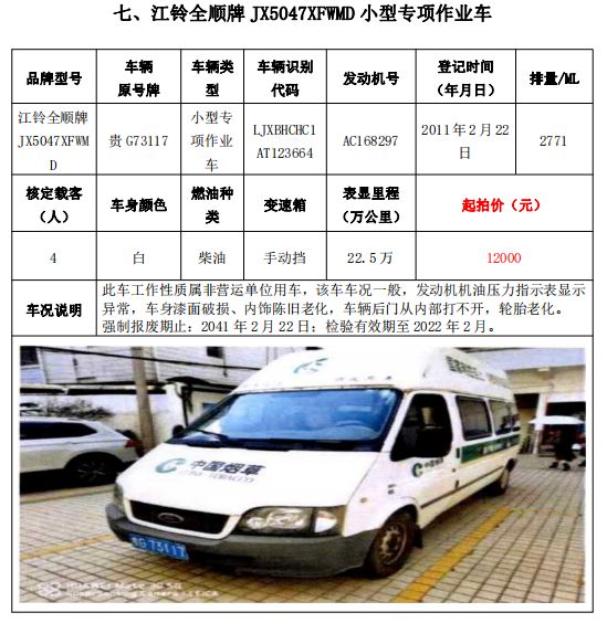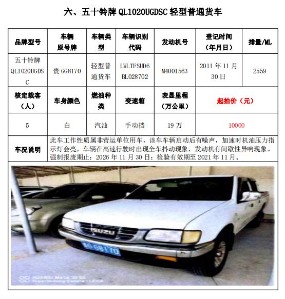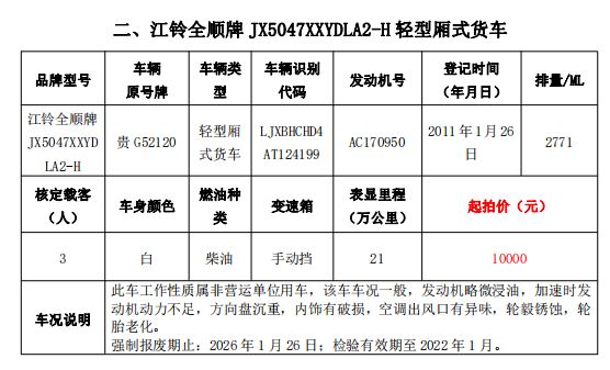 大通牌SH5041XXYA7D4輕型廂式貨車2輛、大通牌SH5041XXYA6D4輕型廂式貨車1輛、江鈴全順牌JX5047XXYDLA2-H輕型廂式貨車2輛、江鈴全順牌JX5047XFWMD小型專項(xiàng)作業(yè)車1輛、五十鈴牌QL1020UGDSC輕型普通貨車1輛、獵豹牌CFA6470M3小型普通客車1輛、獵豹牌CFA6470LA小型越野客車1輛,共計(jì)9輛車整體拍賣。