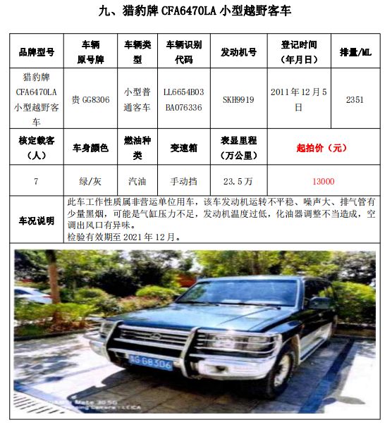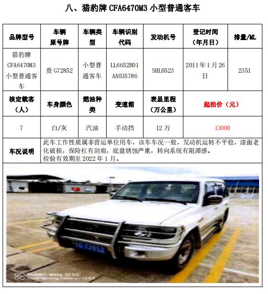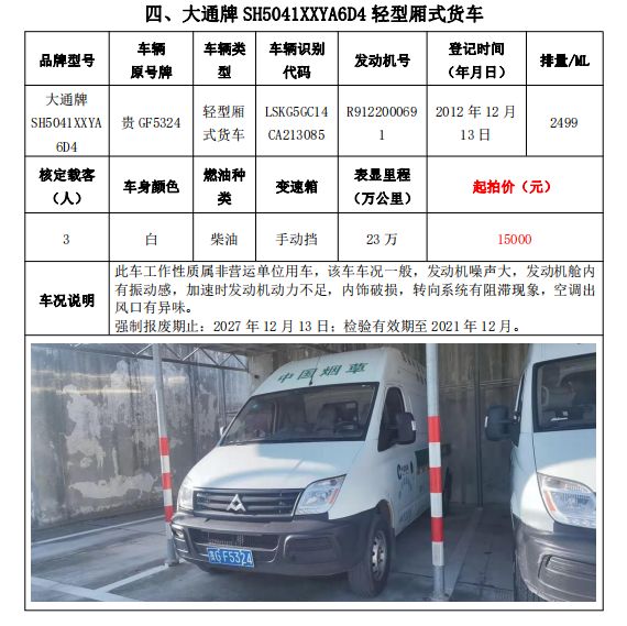受委托,我公司于2021年12月14日(星期二)下午14:30在貴州省貴陽市中華南路20號(hào)新大陸數(shù)碼廣場(chǎng)10樓D座會(huì)議室公開拍賣以下標(biāo)的:大通牌SH5041XXYA7D4輕型廂式貨車2輛、大通牌SH5041XXYA6D4輕型廂式貨車1輛、江鈴全順牌JX5047XXYDLA2-H輕型廂式貨車2輛、江鈴全順牌JX5047XFWMD小型專項(xiàng)作業(yè)車1輛、五十鈴牌QL1020UGDSC輕型普通貨車1輛、獵豹牌CFA6470M3小型普通客車1輛、獵豹牌CFA6470LA小型越野客車1輛,共計(jì)9輛車整體拍賣。