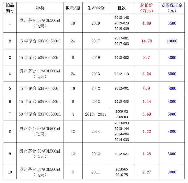 貴州茅臺53%VOL500ml(飛天)、15年茅臺53%VOL500ml、30年茅臺53%VOL500ml等123瓶茅臺酒,分為10個標的。