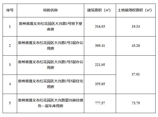 2、貴州省遵義市紅花崗區(qū)大興路1號(hào)地下室?guī)旆浚偨ㄖ娣e:316.03㎡);貴州省遵義市紅花崗區(qū)大興路1號(hào)2層辦公用房(總建筑面積:309.41㎡);貴州省遵義市紅花崗區(qū)大興路1號(hào)5層辦公用房(總建筑面積:221.05㎡);貴州省遵義市紅花崗區(qū)大興路1號(hào)5層住宅用房(總建筑面積:335.65㎡);貴州省遵義市紅花崗區(qū)大興路碧興商住樓負(fù)一層車庫(kù)用房(總建筑面積:777.57㎡)。