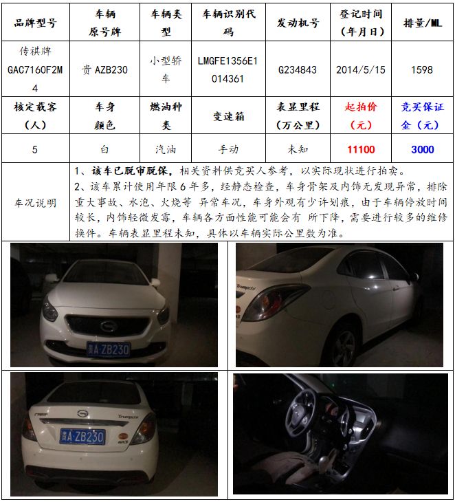 拍品編號(hào)1:傳祺牌GAC7160F2M4小型轎車一輛