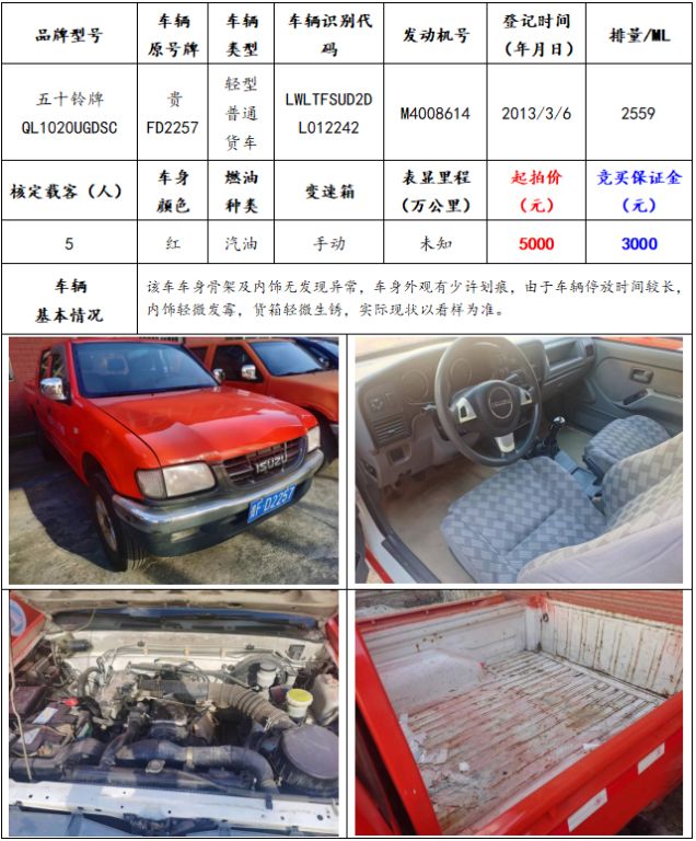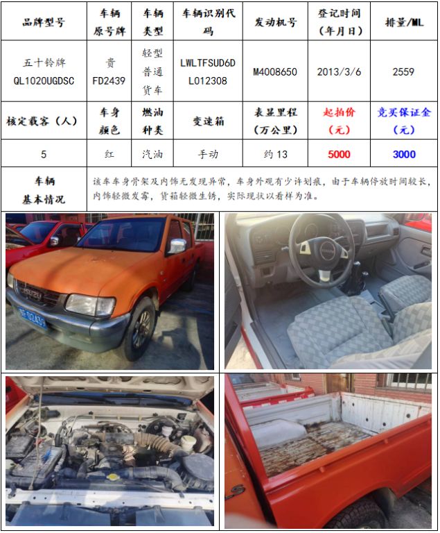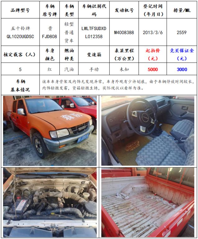 拍品編號(hào)8:五十鈴牌QL1020UGDSC輕型普通貨車一輛