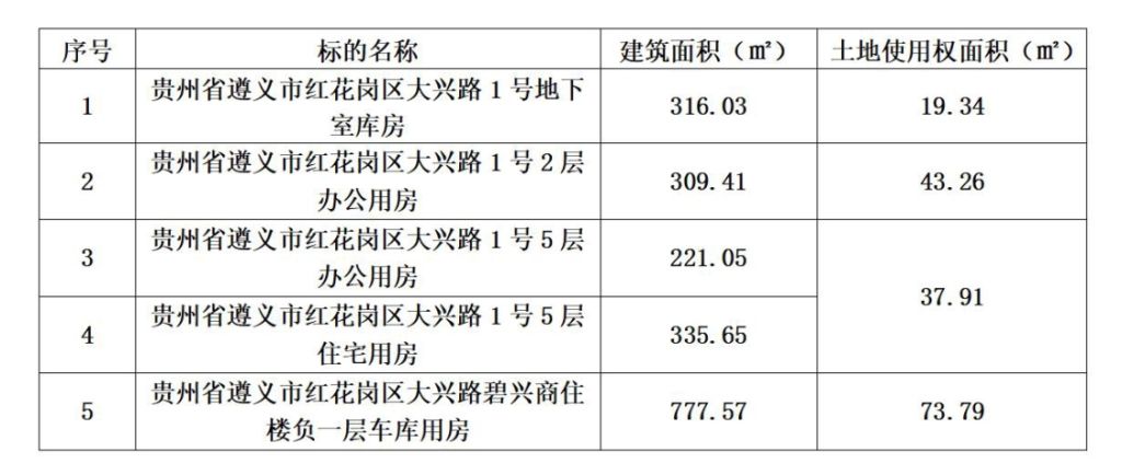 拍品編號(hào)1:貴州省遵義市紅花崗大興路地下室、辦公樓、住宅、車庫(kù)(整體拍賣)
