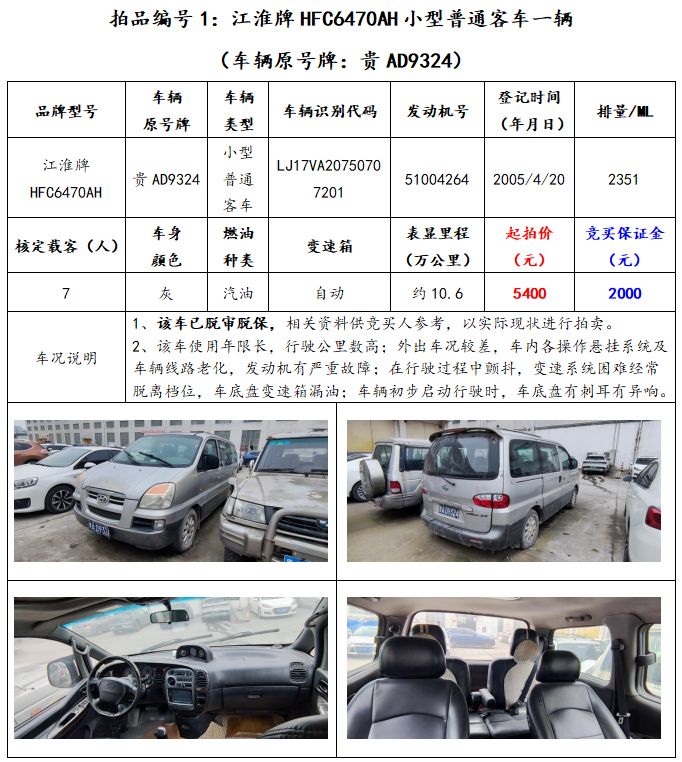 拍品編號(hào)1:江淮牌HFC6470AH小型普通客車(chē)一輛(車(chē)輛原號(hào)牌:貴AD9324);