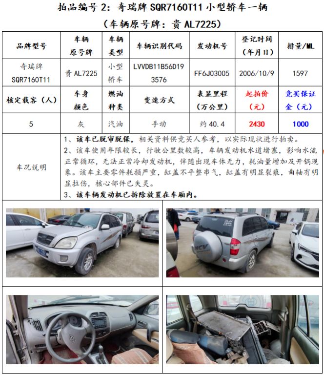 拍品編號(hào)2:奇瑞牌SQR7160T11小型轎車(chē)一輛(車(chē)輛原號(hào)牌:貴AL7225);