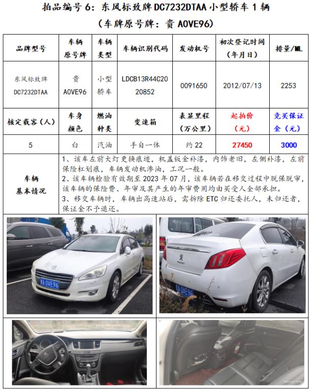 拍品編號(hào)6:東風(fēng)標(biāo)致牌DC7232DTAA小型轎車(chē)1輛(車(chē)牌原號(hào)牌:貴A0VE96);