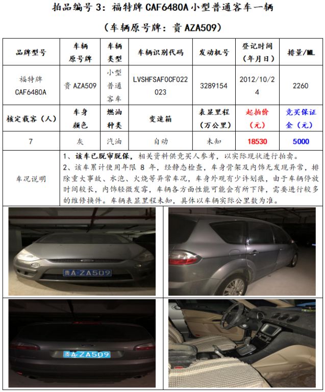 拍品編號(hào)3:福特牌CAF6480A小型普通客車(chē)一輛(車(chē)輛原號(hào)牌:貴AZA509);
