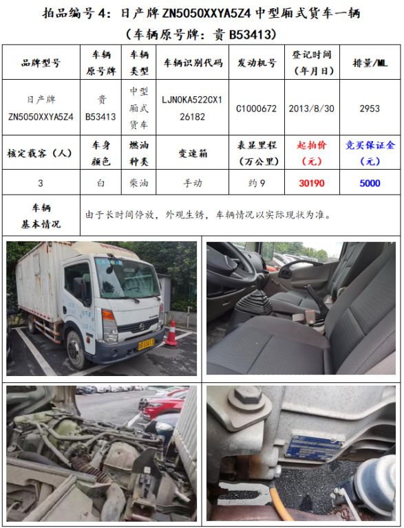拍品編號(hào)4:日產(chǎn)牌ZN5050XXYA5Z4中型廂式貨車(chē)一輛(車(chē)輛原號(hào)牌:貴B53413);