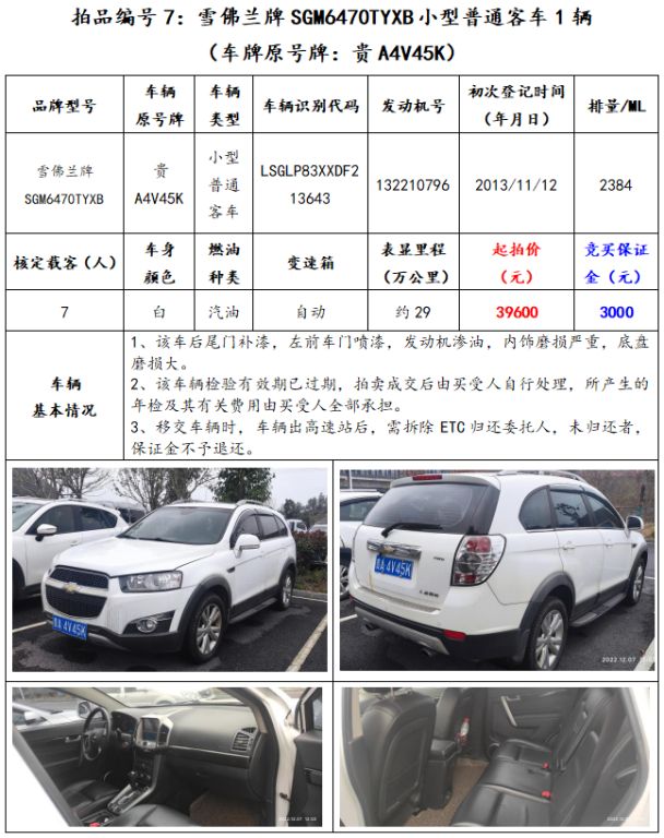 拍品編號(hào)7:雪佛蘭牌SGM6470TYXB小型普通客車(chē)1輛(車(chē)牌原號(hào)牌:貴A4V45K)。