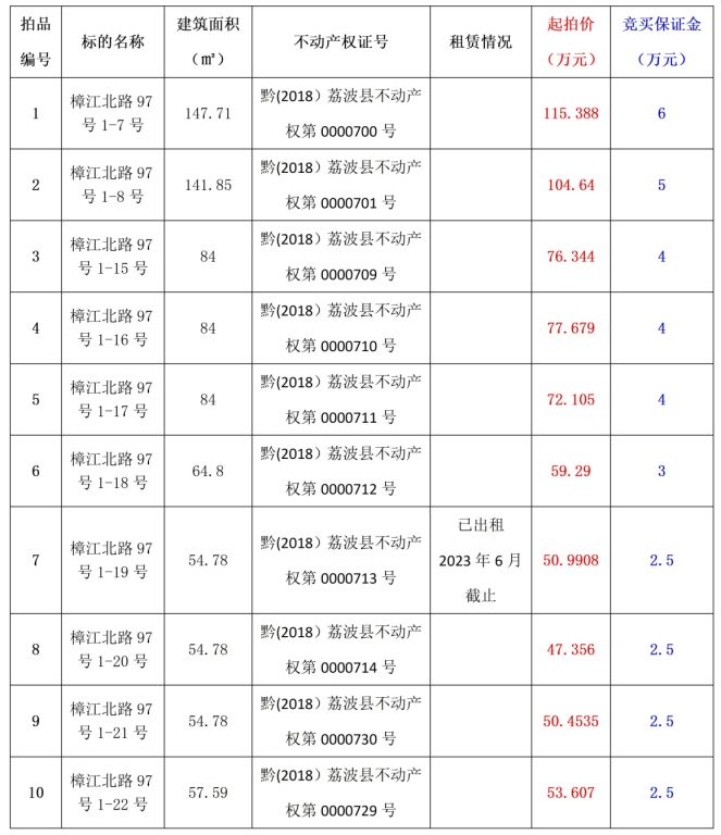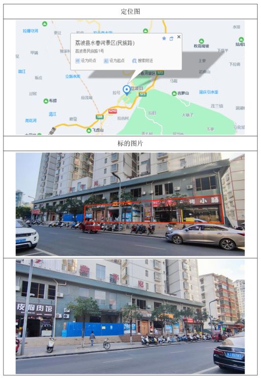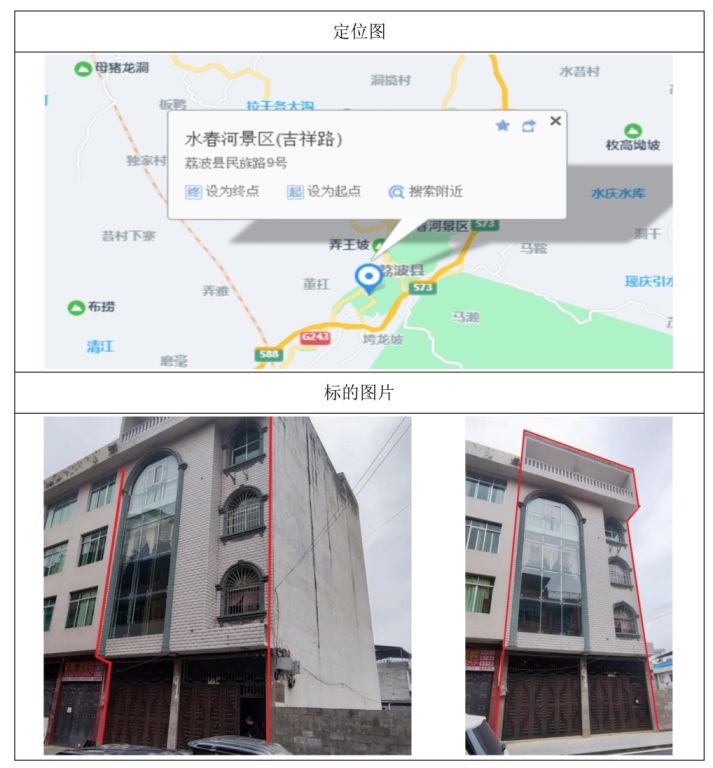 標(biāo)的位于玉屏鎮(zhèn)民族路2號(hào),房屋建筑面積:627.65㎡,產(chǎn)權(quán)完整,2011年建成,房屋總層數(shù)為14層,標(biāo)的所在層數(shù)為1層。不動(dòng)產(chǎn)權(quán)證號(hào):黔房權(quán)證荔波縣字第201300495號(hào),土地所有權(quán)類型:出讓;土地所有權(quán)規(guī)劃用途:商業(yè)用房,建筑結(jié)構(gòu)為鋼混結(jié)構(gòu)。