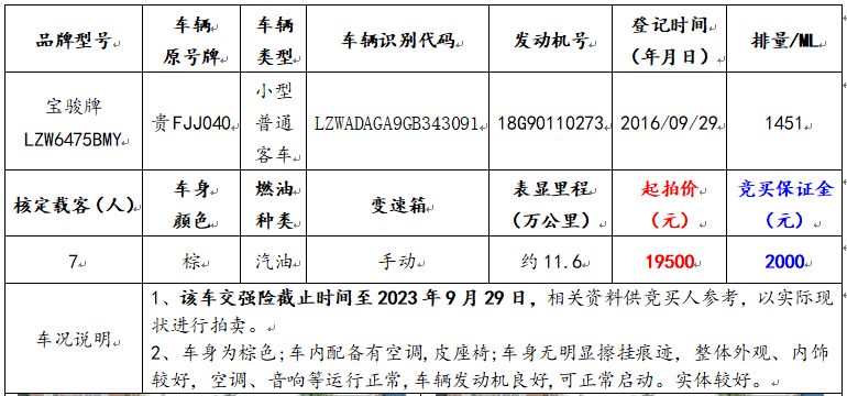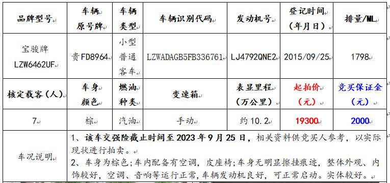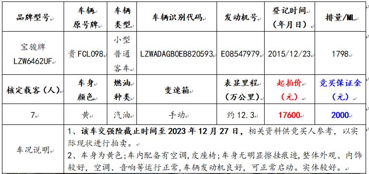 拍品編號1:寶駿牌LZW6462UF小型普通客車一輛(車輛原號牌:貴FCL098);