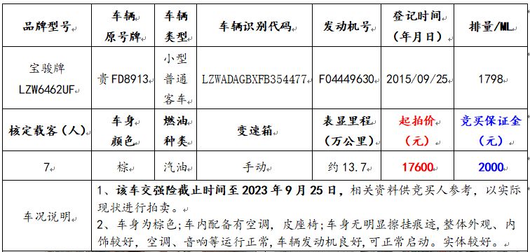 拍品編號2:寶駿牌LZW6462UF小型普通客車一輛(車輛原號牌:貴FD8913);