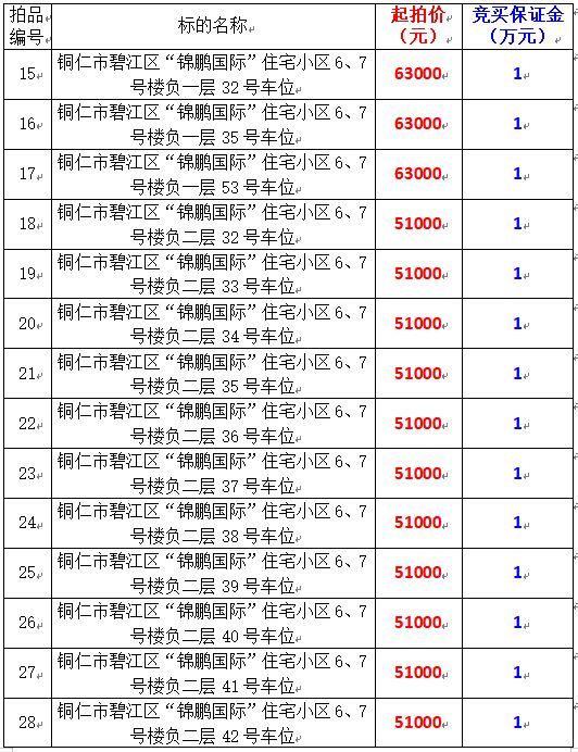 拍品編號15-33:銅仁市碧江區(qū)“錦鵬國際”住宅小區(qū)6、7號樓負(fù)一層:32號、35號、53號,負(fù)二層:32號-47號共計19個車位