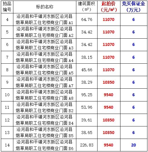 4、沿河縣和平鎮(zhèn)河?xùn)|新區(qū)沿河縣煙草局職工住宅樓商業(yè)門面11間,建筑面積:34.42-226.83㎡,起拍價(jià):9540元/㎡-11070元/㎡,競(jìng)買保證金:6萬(wàn)元/間。