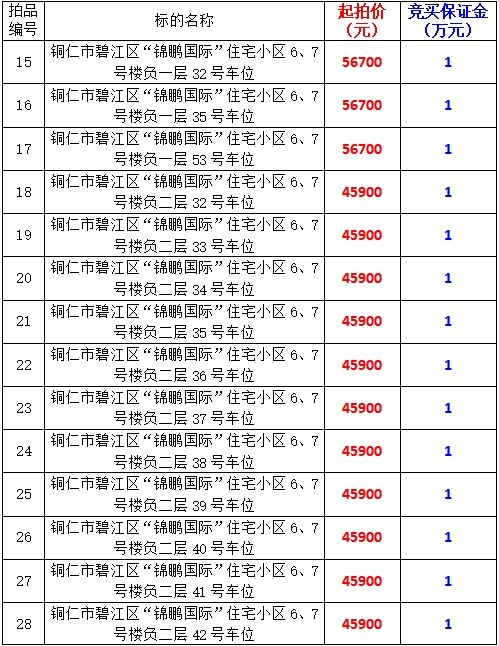5、銅仁市碧江區(qū)“錦鵬國(guó)際”住宅小區(qū)6、7號(hào)樓負(fù)一層;32號(hào)、35號(hào)、53號(hào),負(fù)二層;32號(hào)-47號(hào)共計(jì)19個(gè)車位,起拍價(jià):45900元-56700元,競(jìng)買保證金:1萬(wàn)元/個(gè)。