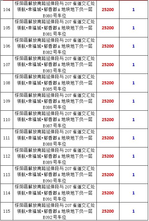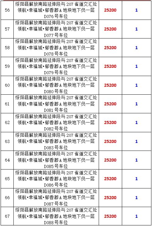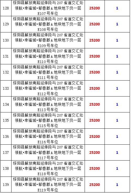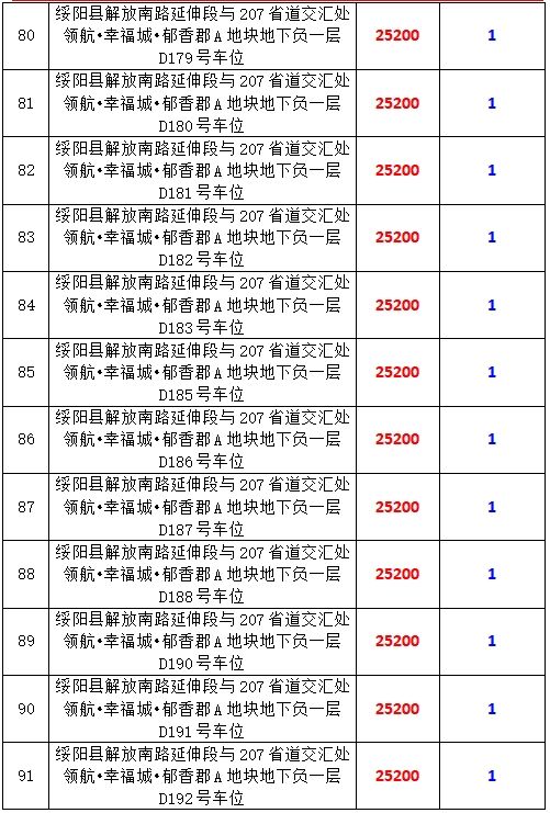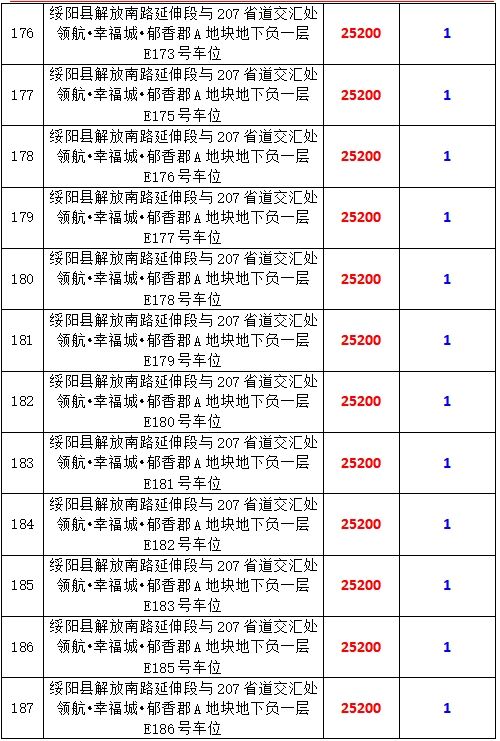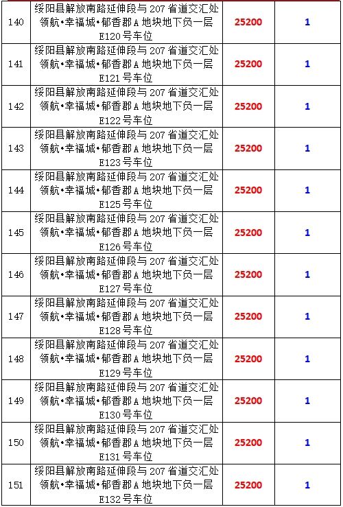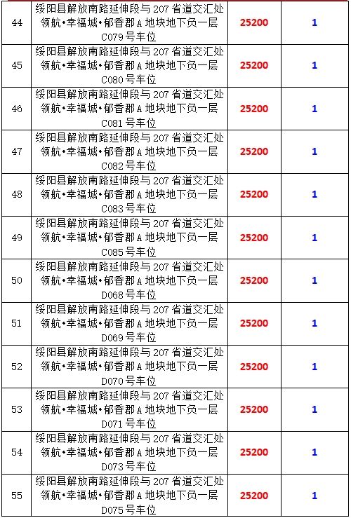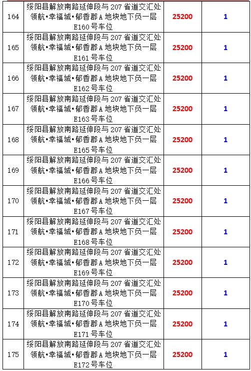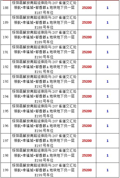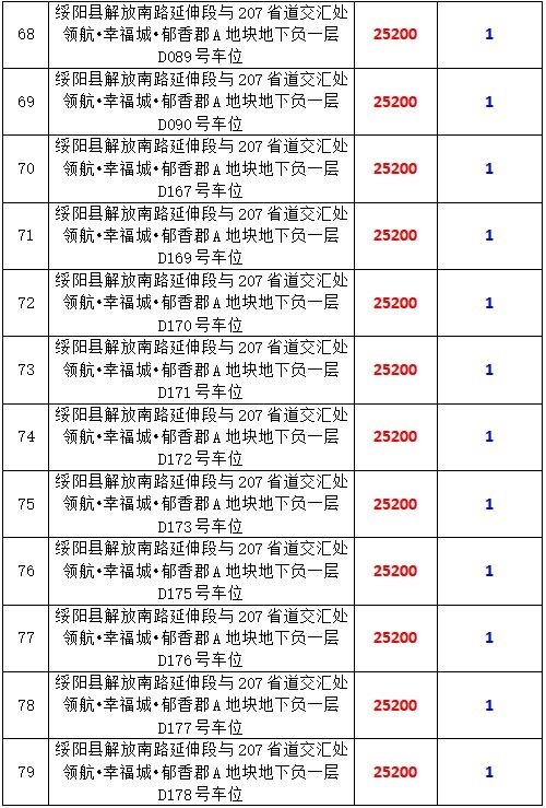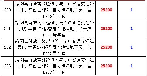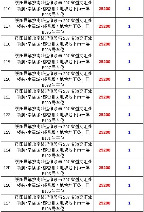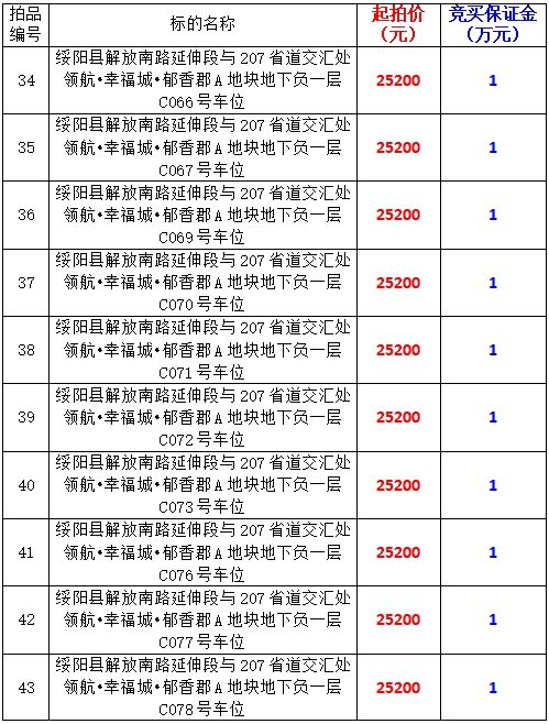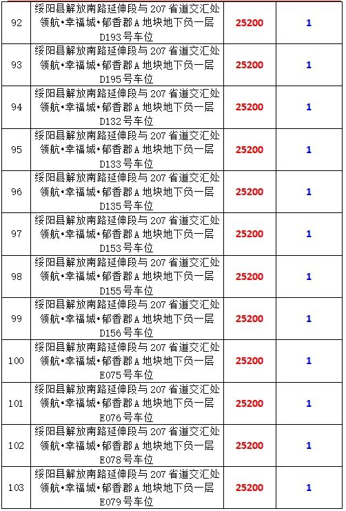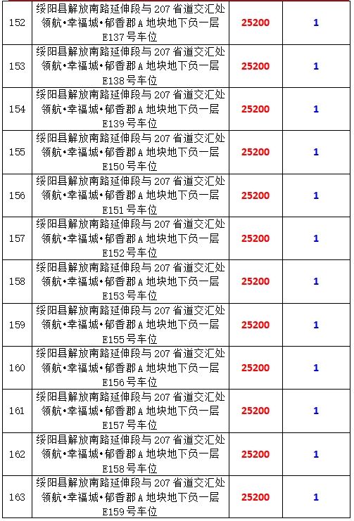 6、綏陽(yáng)縣解放南路延伸段與207省道交匯處領(lǐng)航?幸福城?郁香郡A地塊地下負(fù)一層170個(gè)車位,起拍價(jià):25200元/個(gè),競(jìng)買保證金:1萬(wàn)元/個(gè)。