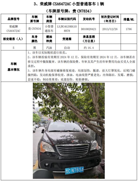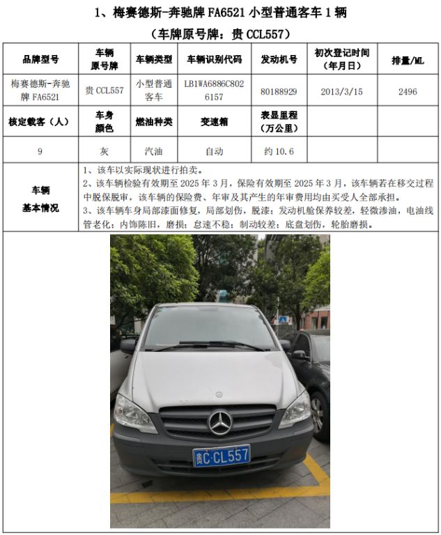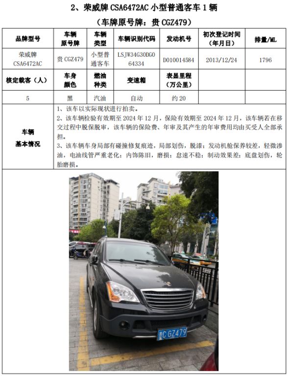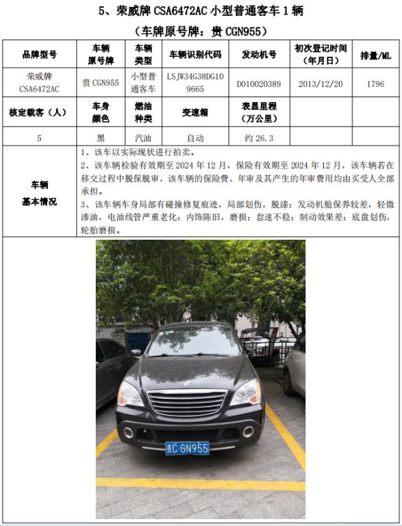 拍品編號(hào)2:梅賽德斯-奔馳牌FA6521小型普通客車(chē)1輛、榮威牌CSA6472AC小型普通客車(chē)3輛、雪佛蘭牌SGM6470TAAD小型普通客車(chē)1輛,共計(jì)5輛,整體拍賣(mài)