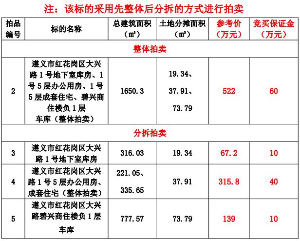 標(biāo)的:遵義市紅花崗區(qū)大興路1號(hào)地下室?guī)旆俊?號(hào)5層辦公用房、1號(hào)5層成套住宅、碧興商住樓負(fù)1層車(chē)庫(kù)