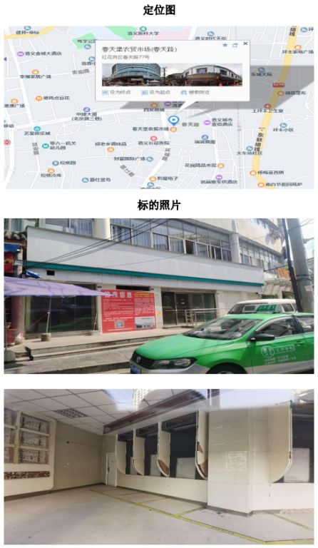 標的坐落于貴州省遵義市紅花崗區(qū)外環(huán)路春天堡綜合批發(fā)大樓1層,房屋建筑面積為:98.83㎡,位于環(huán)城路與春天堡市場入口處的獨立商業(yè)用房,臨街寬度約10m,進深約14m;房屋總層數(shù)為9層,標的所在層數(shù)為1層,層高約3.3m;權(quán)利類型:國有建設(shè)用地使用權(quán)/房屋所有權(quán);權(quán)利性質(zhì):劃撥/市場化商品房;用途:其他商服用地/商業(yè)、金融、信息;房屋結(jié)構(gòu):其它結(jié)構(gòu),目前為閑置狀態(tài)。