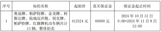 拍品編號1:奧迪牌、帕薩特牌、金龍牌、柯斯達(dá)牌、陸地巡洋艦、別克牌、帕薩特牌、紅旗牌機(jī)動車輛共計(jì)13輛,整體拍賣