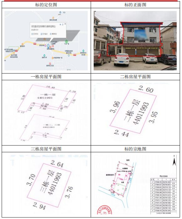 標(biāo)的坐落于安龍縣新橋鎮(zhèn)街上,房屋為自建房,由3幢房屋組成,證載總建筑面積:332.79㎡,實測總建筑面積:357.94㎡,其中1幢總層數(shù)為3層,證載建筑面積:312.26㎡,實測建筑面積:338.52㎡;2-3幢總層數(shù)為1層,所在樓層為1層,2幢證載建筑面積:10.81㎡,實測建筑面積:9㎡,3幢證載建筑面積:9.72㎡,實測建筑面積:10.42㎡。房屋產(chǎn)權(quán)證號:安房權(quán)證新橋鎮(zhèn)字第00003462號,設(shè)計用途分別為辦公住宅、其它,混合結(jié)構(gòu);土地使用權(quán)證號:安國用(2014)第20號,證載土地使用權(quán)面積:443.24㎡,實測土地使用權(quán)面積:443.24㎡,地類(用途)金融用地,使用權(quán)類型為出讓,終止日期為2054年11月22日止。