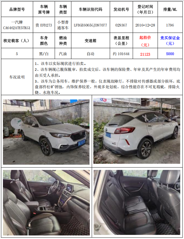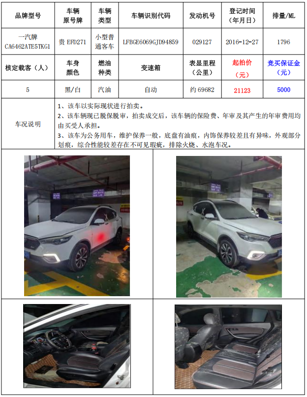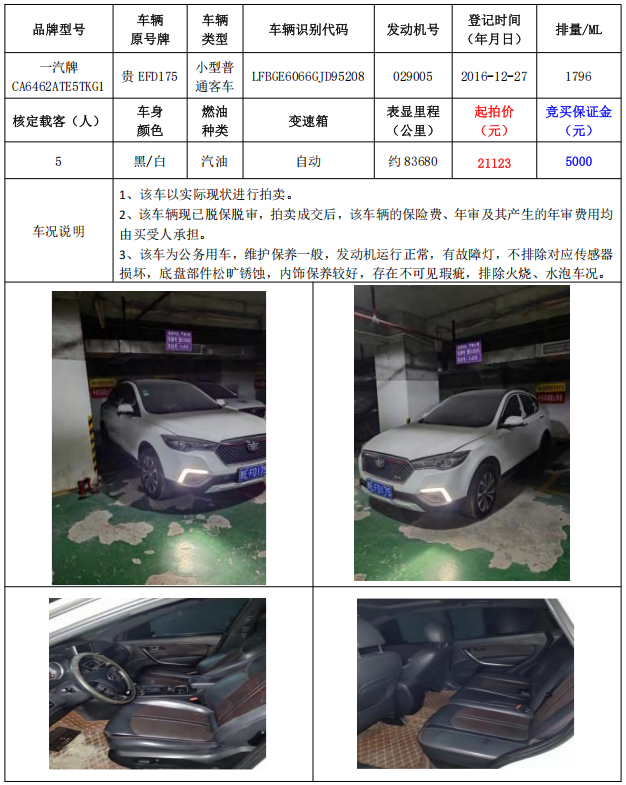 拍品編號2:一汽牌CA6462ATE5TKG1小型普通客車1輛