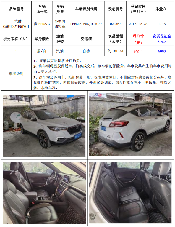 拍品編號(hào)1:一汽牌CA6462ATE5TKG1小型普通客車1輛(車輛原號(hào)牌:貴EFD271)