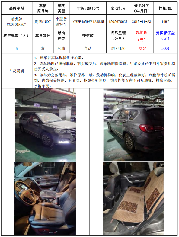 拍品編號(hào)6:哈弗牌CC6461RM07小型普通客車1輛(車輛原號(hào)牌:貴EM1507)