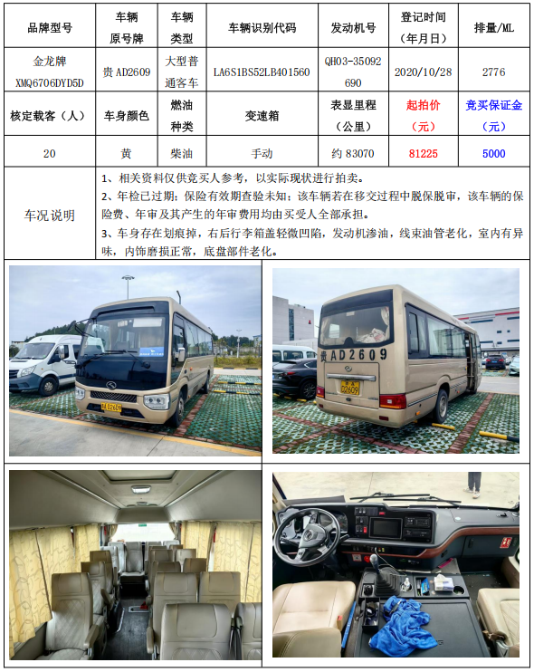 拍品編號(hào)8:金龍牌XMQ6706DYD5D大型普通客車一輛(車輛原號(hào)牌:貴AD2609)