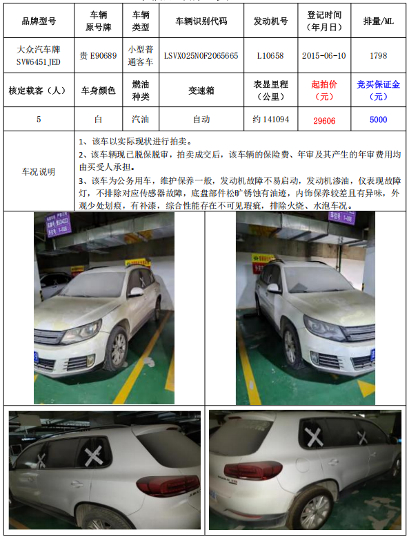 拍品編號(hào)7:大眾汽車牌SVW6451JED小型普通客車1輛(車輛原號(hào)牌:貴E90689)