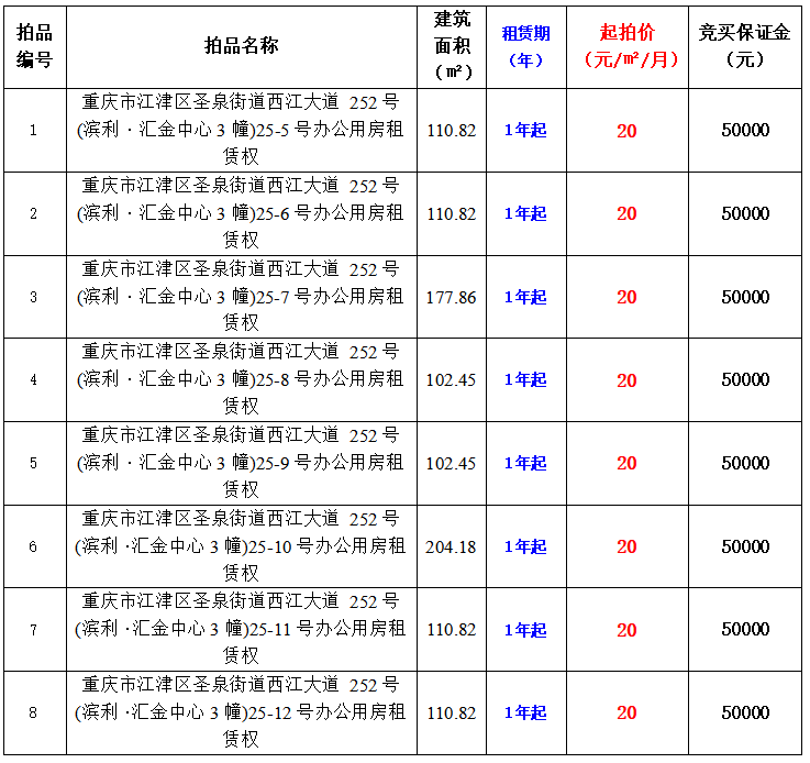 1、重慶市江津區(qū)圣泉街道西江大道 252號(濱利·匯金中心3幢) 25 層辦公用房8間租賃權(quán),建筑面積:102.45㎡-204.18㎡,租賃權(quán)起拍價:20元/㎡/月/間,競買保證金:5萬元/間。