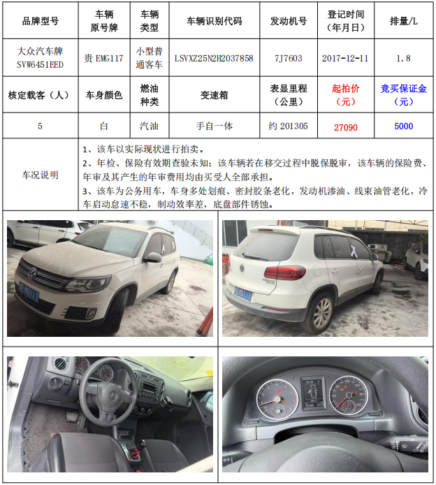 拍品編號(hào)2:大眾汽車牌SVW6451EED小型普通客車一輛(車輛原號(hào)牌:貴EMG117)