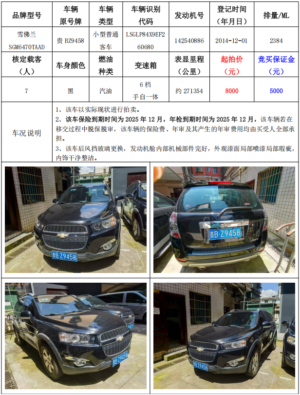 拍品編號(hào)1:雪佛蘭SGM6470TAAD小型普通客車一輛(車輛原號(hào)牌:貴BZ9458)