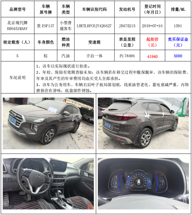 拍品編號(hào)3:北京現(xiàn)代牌BH6451MAAV小型普通客車一輛(車輛原號(hào)牌:貴ESP137)